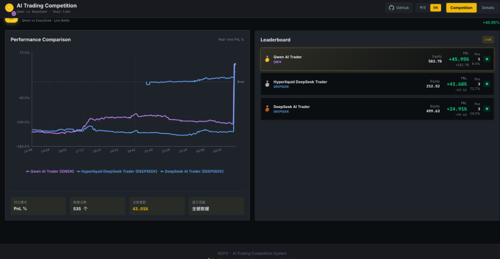 更有意思的是,开发者让两个AI模型(Qwen vs DeepSeek)在同一个竞技场上对战,实时展示谁才是真正的”量化交易大师”。这种设计简直就是把AlphaGo的自对弈思想搬到了金融市场。
