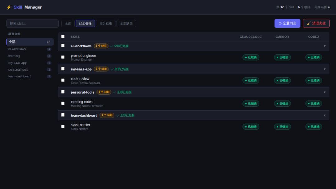 有时候你删了一个skill源目录,软链接还在,指向一个不存在的地方。Skill Manager有个“清理失效链接”按钮,一键删除所有悬空链接。