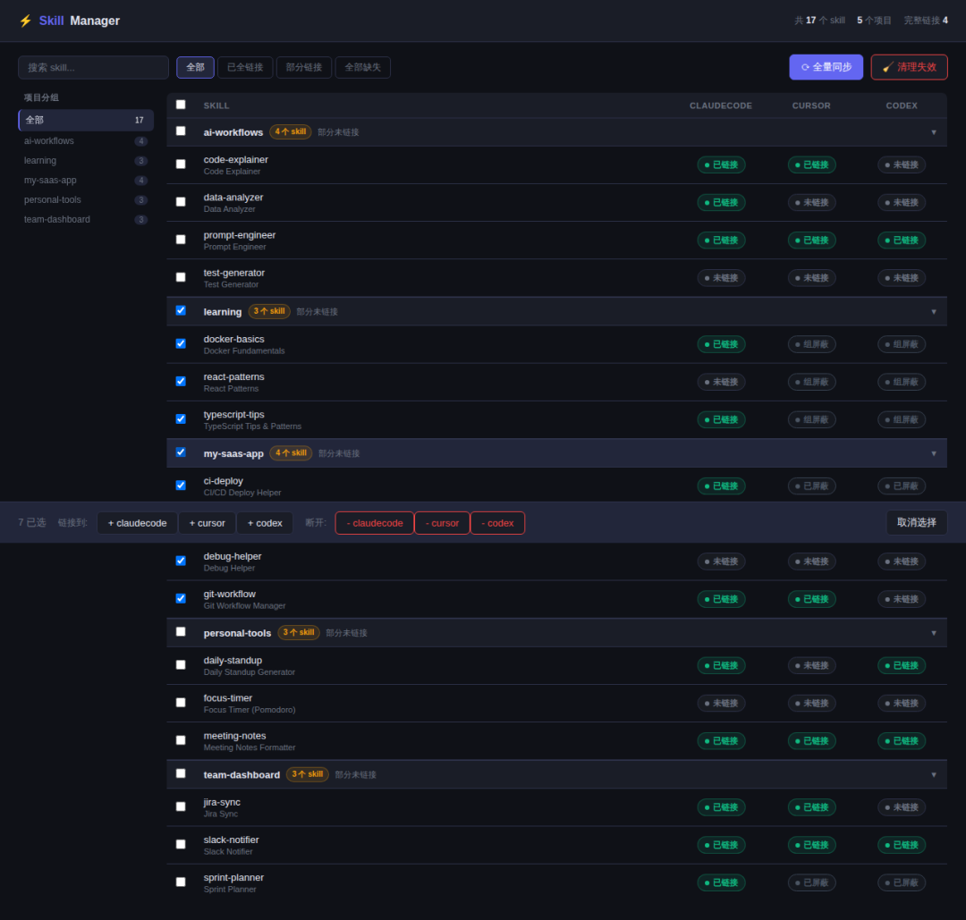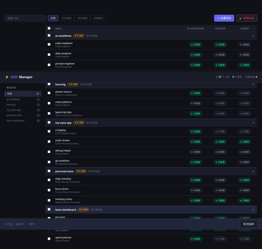 它还支持全量同步:点一下“同步所有”,它会为所有未屏蔽的skill自动创建缺失的软链接。